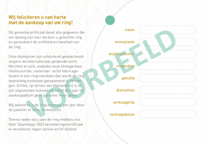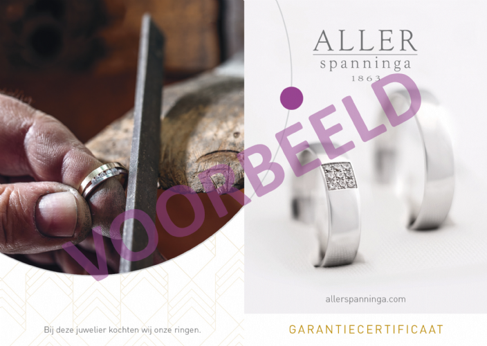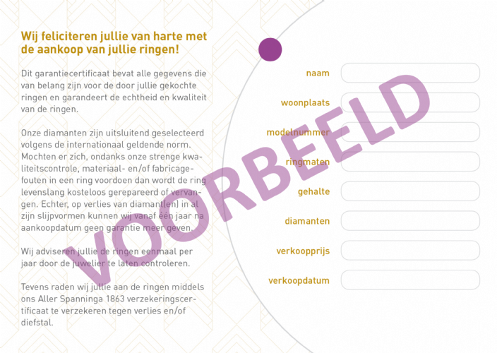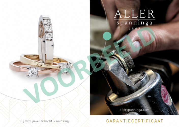 Je hebt een ring gekocht, gefeliciteerd! Nu krijg je een garantiecertificaat met alle informatie over de ring. Heb je vragen? Ga naar één van de juweliers!